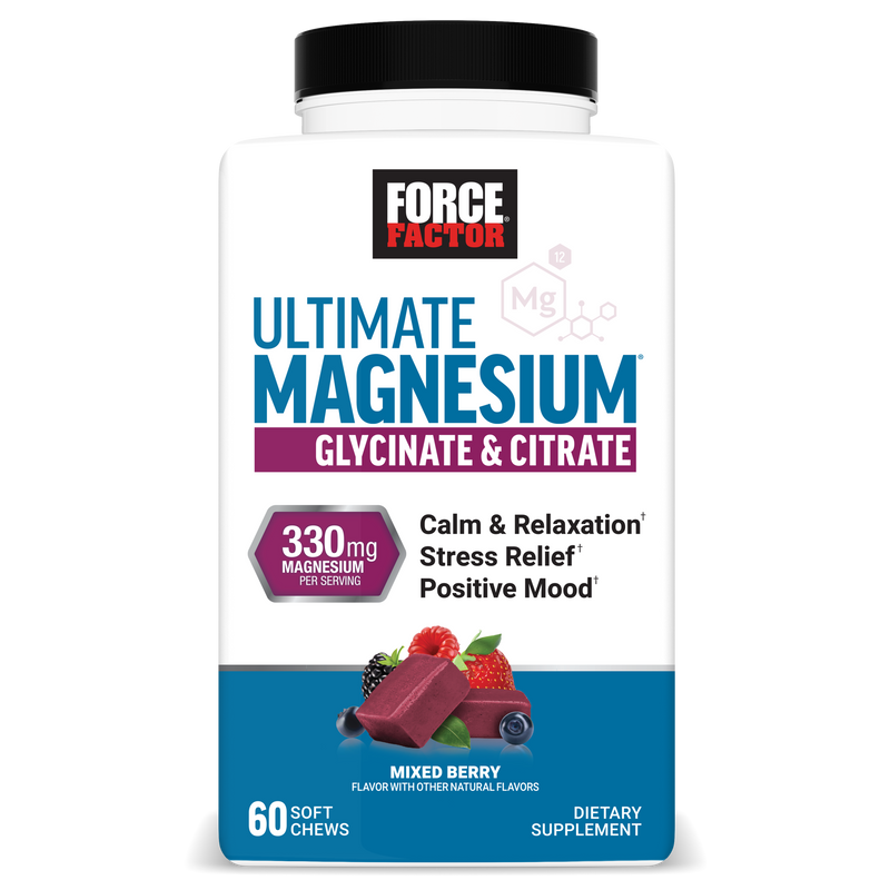 Force Factor Ultimate Magnesium Soft Chews provide 330mg of highly absorbable magnesium glycinate and citrate per serving to support relaxation, muscle recovery, stress relief, and overall wellness. Infused with L-theanine, GABA, and passion flower, these delicious Mixed Berry-flavoured soft chews help calm the mind, ease tension, and promote a balanced mood.