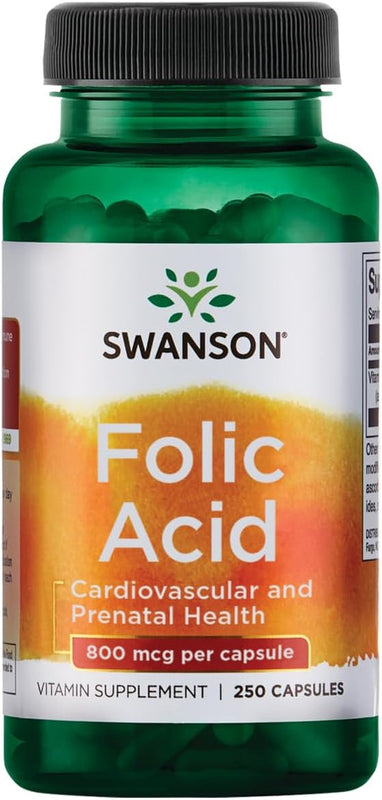 Support essential daily wellness with Swanson Folic Acid, delivering 800 mcg of folic acid per capsule to promote heart health, red blood cell formation, and prenatal nutritional support.