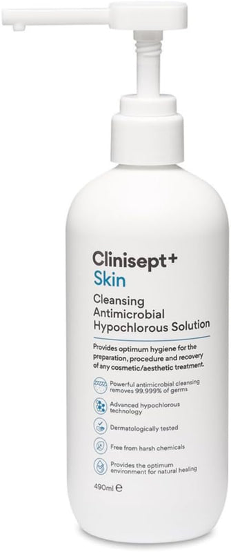 Clinisept+ Skin Prep Solution is a professional-grade cleanser designed for in-clinic use before, during, and after aesthetic and cosmetic procedures. Its high-purity hypochlorous acid formula offers a gentle yet effective cleanse, maintaining a skin-neutral pH while being free from alcohol and fragrances.