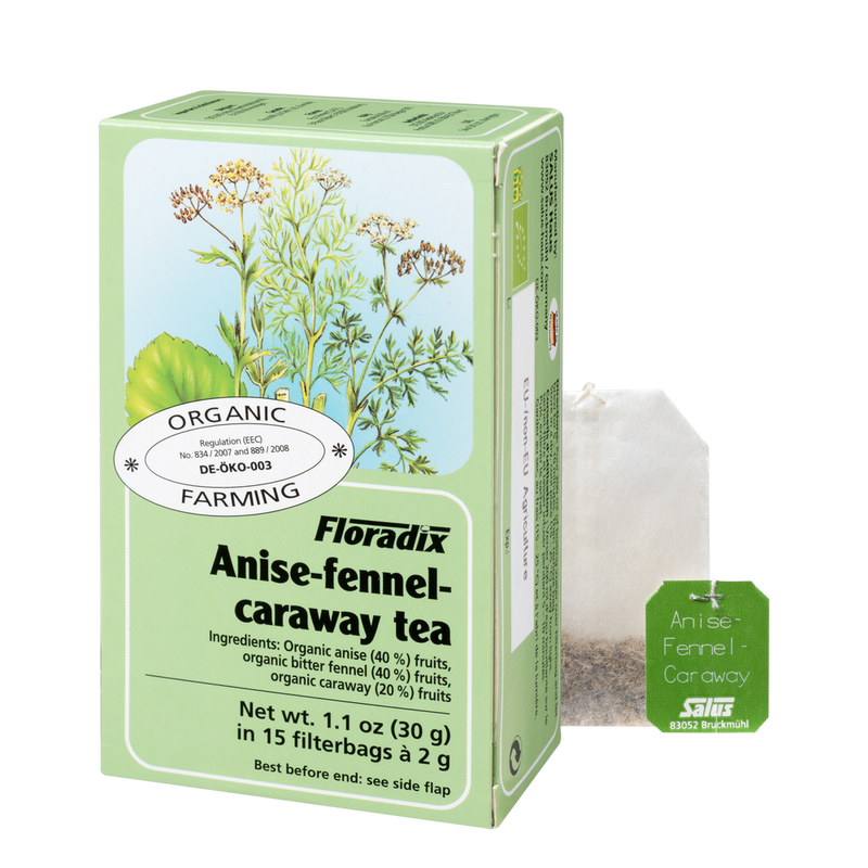 Organic Anise Fruits (Pimpinella anisum) (40%), Organic Bitter Fennel Fruits (Foeniculum vulgare) (40%), Organic Caraway Fruits (Carum carvi) (20%).
