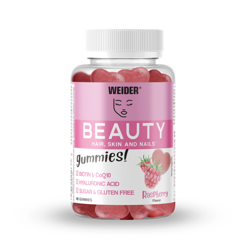 WEIDER Beauty Gummies are a sugar-free, gluten-free supplement designed to support healthy hair growth, radiant skin, and strong nails. Each raspberry-flavoured gummy delivers a targeted blend of biotin, CoQ10, and hyaluronic acid—nutrients known to promote cellular hydration, collagen production, and antioxidant protection. With a convenient chewable format and no added sugars, this beauty-focused formula is ideal for daily use.