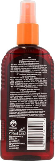 Malibu Sun SPF 4 Bronzing Tanning Oil Spray offers very low sun protection for skin that tans easily, combined with the hydrating properties of Monoi Oil. This water-resistant, tropical-scented dry oil spray provides a light, non-greasy feel.