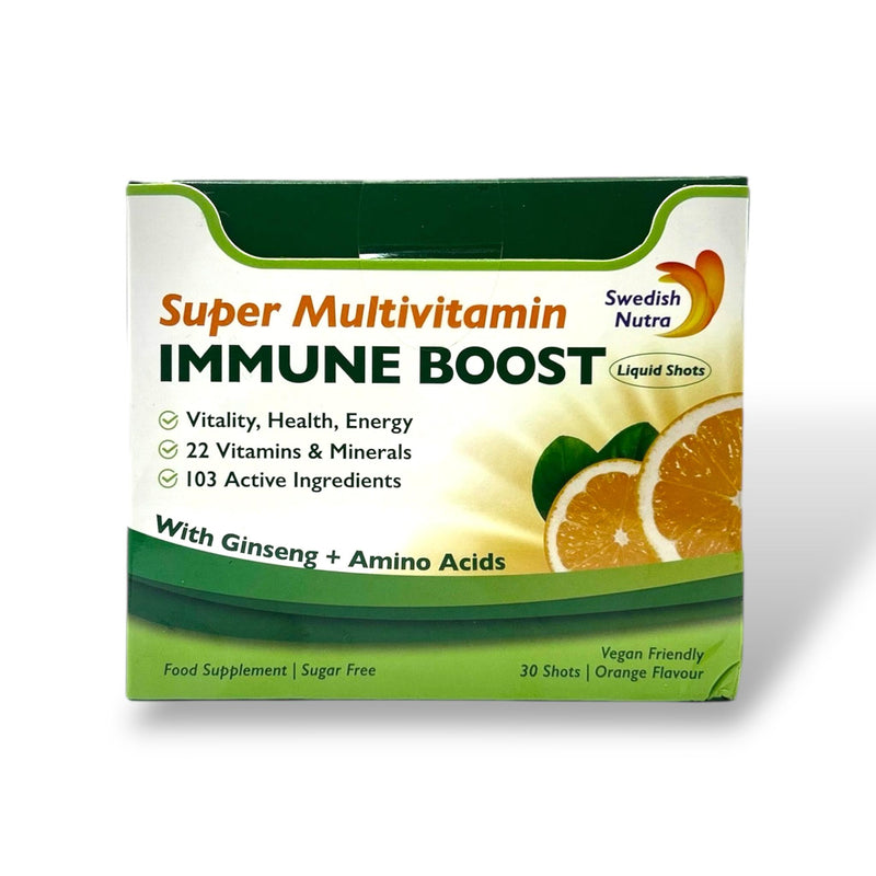Swedish Nutra Super Multivitamin Immune Boost is a high-strength liquid supplement designed to support immune health, energy, and mental performance. With 103 active ingredients, including 22 vitamins and minerals, ginseng, and amino acids, this formula helps strengthen immunity, enhance focus, and boost overall vitality.