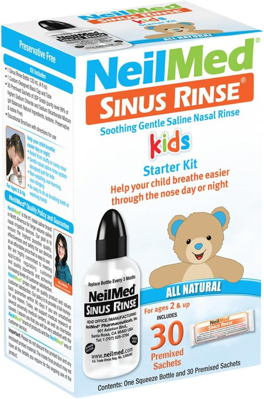 The NeilMed Sinus Rinse Pediatric Starter Kit offers a gentle, upright system designed for children aged two and above to comfortably experience the benefits of saline nasal irrigation. This complete kit provides a drug-free, preservative-free approach to helping clear the nasal passages, soothe irritation, and support a feeling of nasal freshness as part of a daily hygiene routine. Crafted with paediatric comfort and safety in mind, it features a low-pressure squeeze bottle and pre-measured, pH-balanced packets for a consistent and soothing experience.