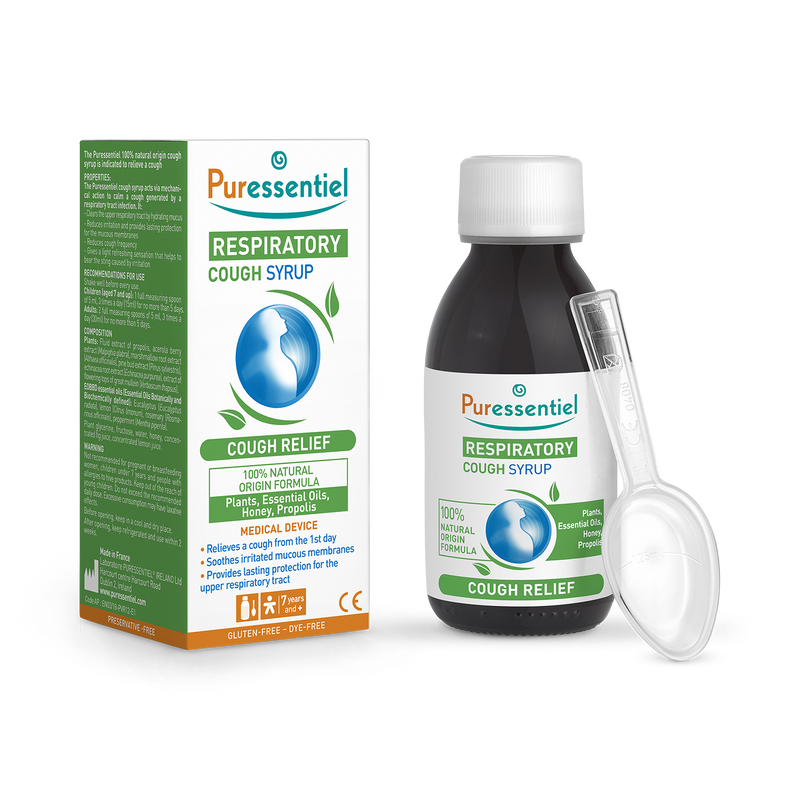 Formulated for both adults and children from age 7, Puressentiel Respiratory Soothing Syrup is a 100% natural-origin botanical blend. This syrup combines the cherished properties of honey and propolis with a soothing herbal extract complex and purifying essential oils. Its pleasant taste and gentle formula are designed to provide comforting support for the throat and respiratory system as part of your family's wellness routine.