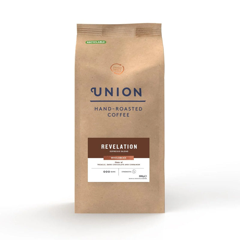 Union Revelation Espresso Blend is crafted for espresso preparation. This dark roast whole bean coffee combines beans from Costa Rica, Sumatra, Rwanda, and Guatemala. Roasted in small batches, it offers a complex cup with noted flavours of treacle, dark chocolate, and cinnamon. The 500g pack is ideal for espresso enthusiasts seeking excellent value.