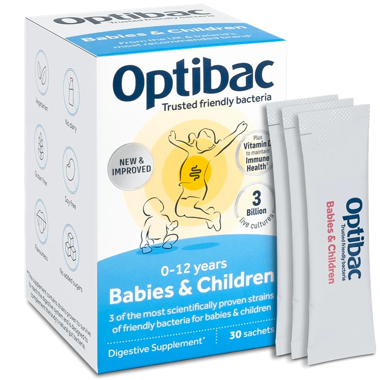 Optibac Babies & Children is a friendly bacteria supplement specially developed for babies, toddlers, and children from birth to 12 years. It contains a unique blend of three scientifically researched strains of probiotics, prebiotic fibers (FOS), and added Vitamin D3 to support immune health.